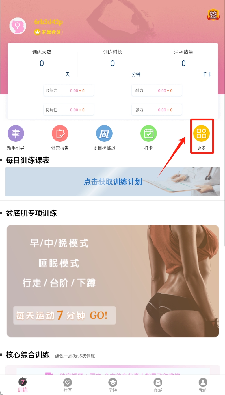 1、打开app并注册登录到训练主界面,在上面包含新手引导、健康报告、周目标挑战、打卡以及更多功能按钮,选择更多。