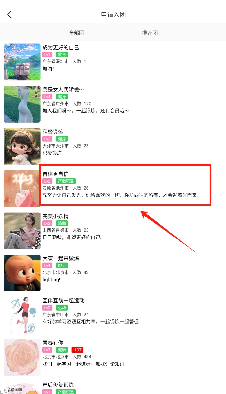 3、申请入团中划分了全部团和推荐团两个部分,选择其中一个点击进入到详情页面。
