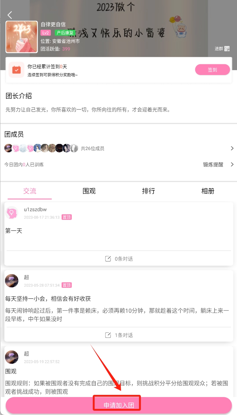 4、进团后你就可以每天在这里点击签到,不过入团需要团长同意,在这里你会看到团成员是谁,以及他们的活跃值,点击下方的“申请加入团”,明确加入的话直接点击确定即可。