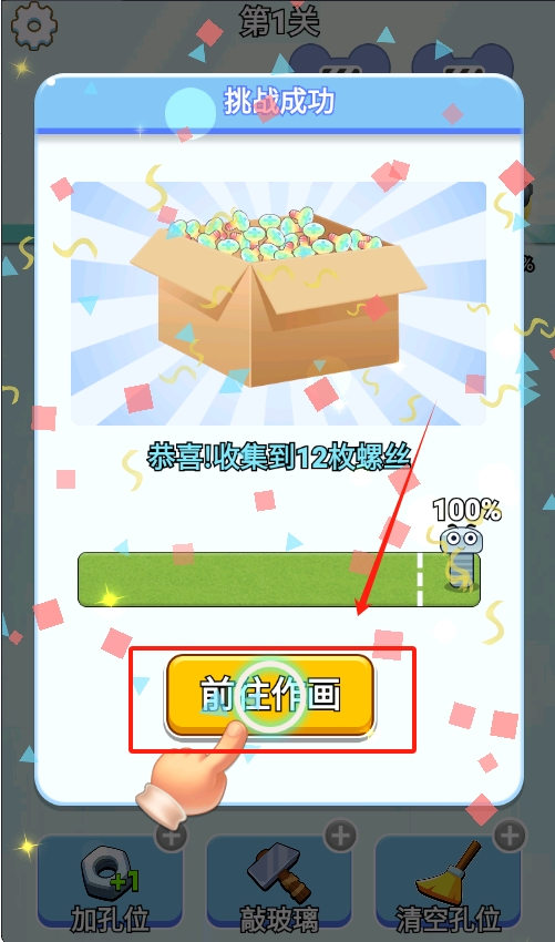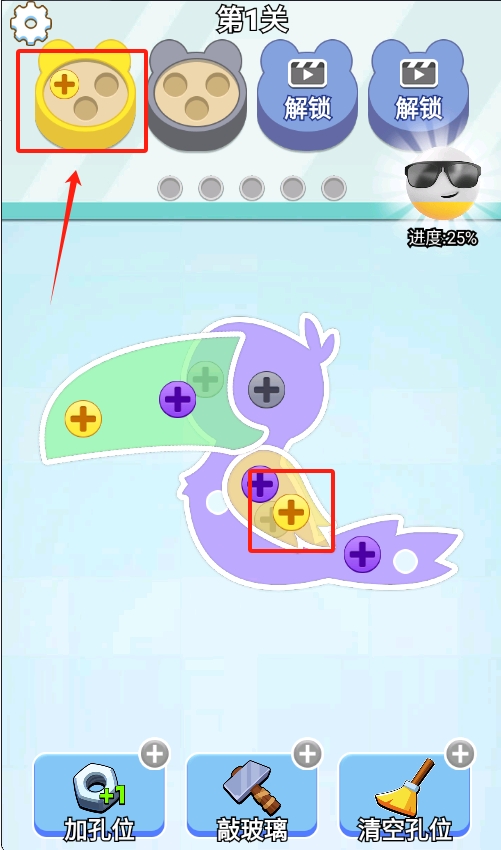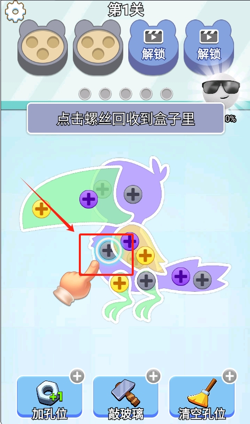 3、关注布局情况:收纳螺丝钉时,玩家需关注布局,找到同色元素并收集起来。