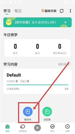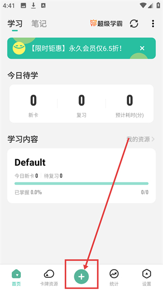 1、在学习首页点底部的【+】按钮,能弹出功能选项,后续可选择添加知识卡来记录内容啦。