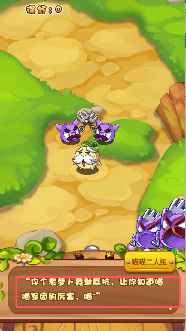 1、喵喵大王率领军团全面进攻蔬菜村,原本安静祥和的家园面临空前危机,玩家需要帮助蔬菜们保卫家园。