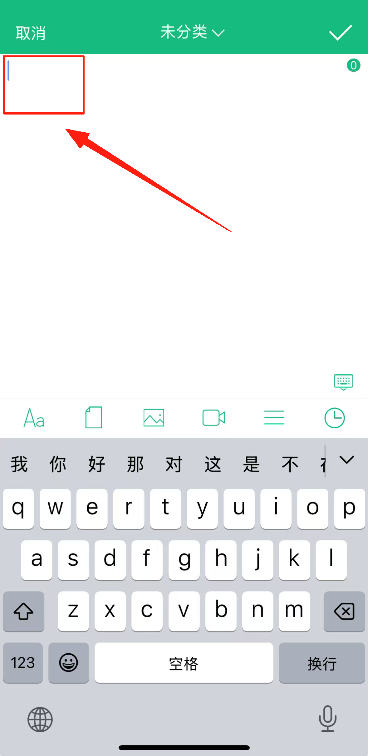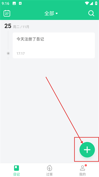 1、在【吾记】APP的日记页面,点击右下角绿色加号按钮,进入新日记编辑界面,准备记录内容啦。