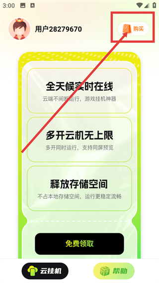 1、在云挂机页面点击右上角的【购买】按钮,就能进入购机选择界面,开始挑选合适的云机套餐啦。