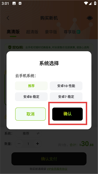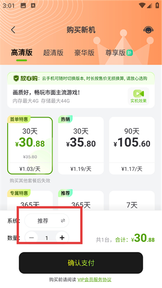 2、进入【购买新机】页面后,选好套餐时长与数量,确认金额后就能准备选择系统版本咯。