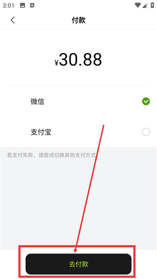 4、进入付款页面后,选好支付方式,点击【去付款】按钮就能完成云机套餐的支付流程啦。