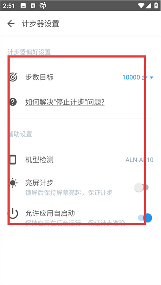 2、进入计步器设置页后,能调整【步数目标】,还能开启【允许应用自启动】来保证计步准确哦。