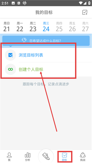 3、点底部的【目标】按钮进入我的目标页,选【创建个人目标】,就能开始设置专属目标啦。