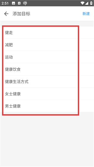 4、进入添加目标页后,能看到【健走】【减肥】等目标类型,选对应的类型就能创建目标啦。