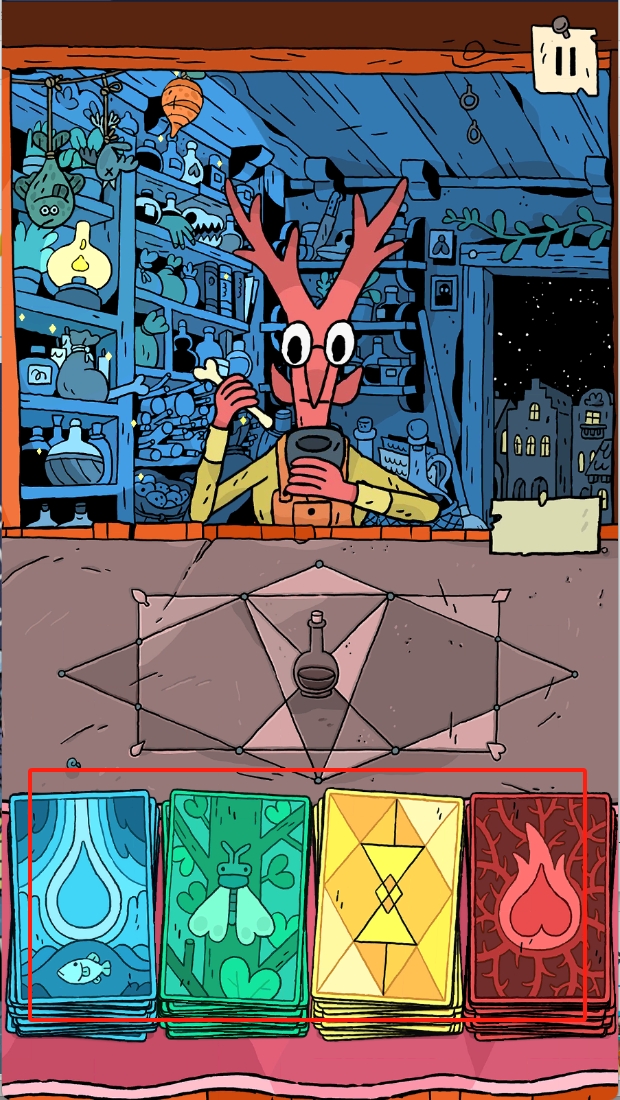 2、卡片组合:游戏中有四种不同颜色的卡片,玩家可以通过自由组合,制作出不同效果的药水。
