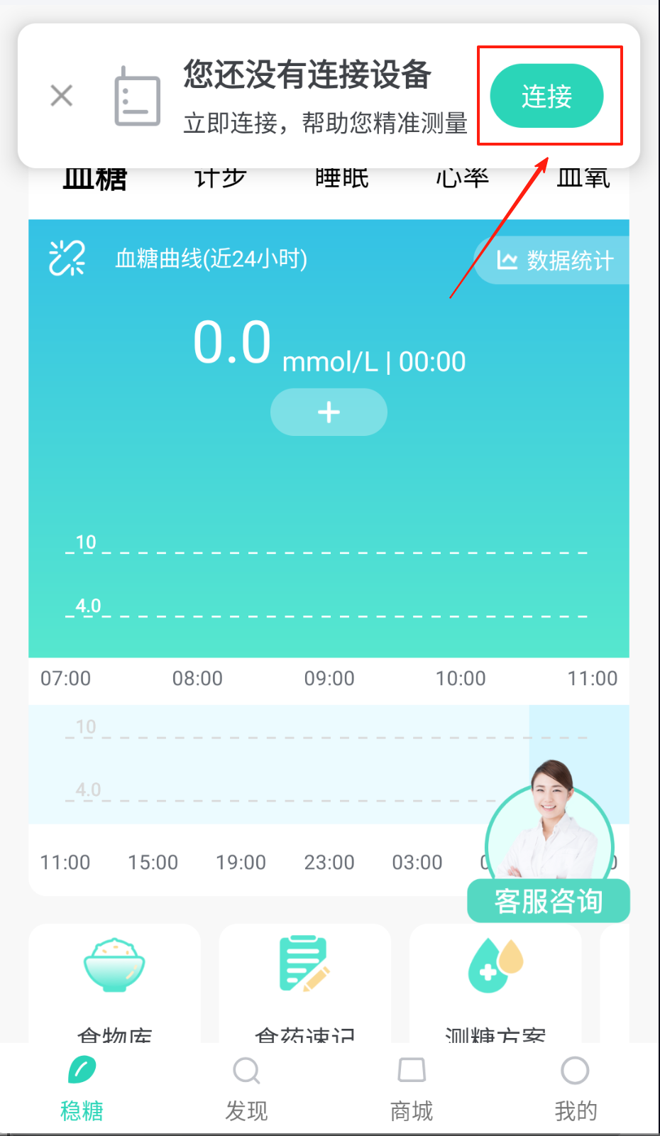 1、点首页连接键,选对应设备按步骤配对,实时查看血糖数值变化。