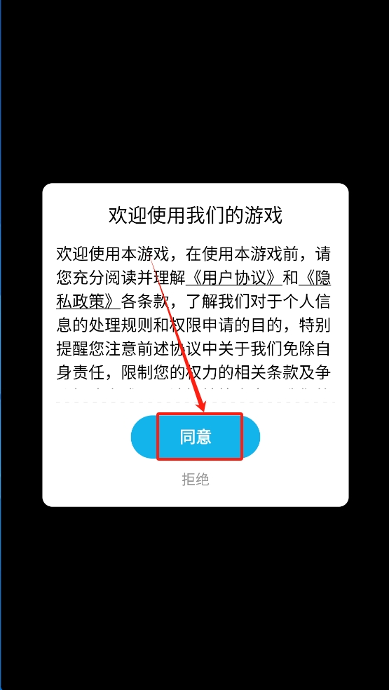 1、同意游戏的用户协议和隐私政策,点击“同意”按钮。