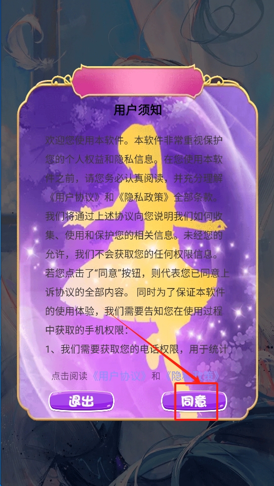 1、首先,同意用户须知以继续游戏进程。