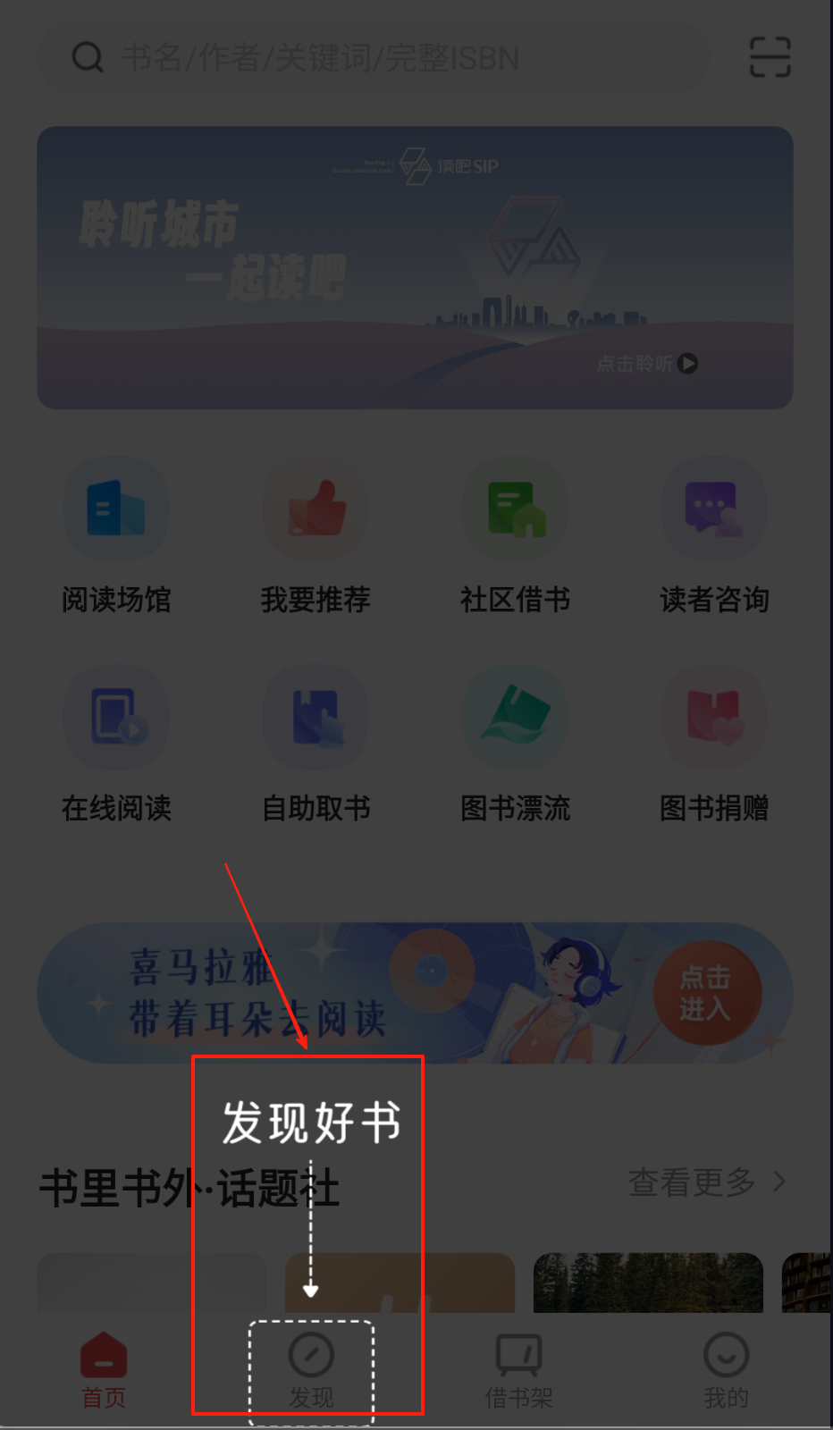 2、首页中部有“在线阅读”“图书漂流”八个功能按钮,点击“喜马拉雅”能听书,红色框里的“常见问题解答”记得看看。