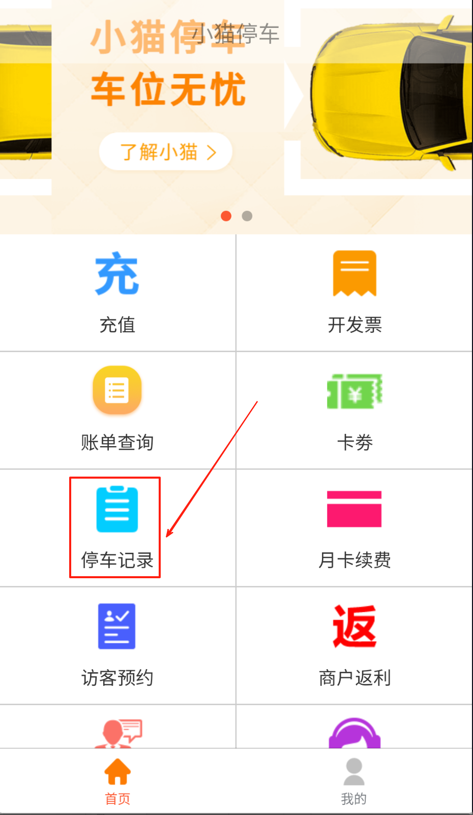 1、下载小猫停车,点击进入首页,查看停车信息。