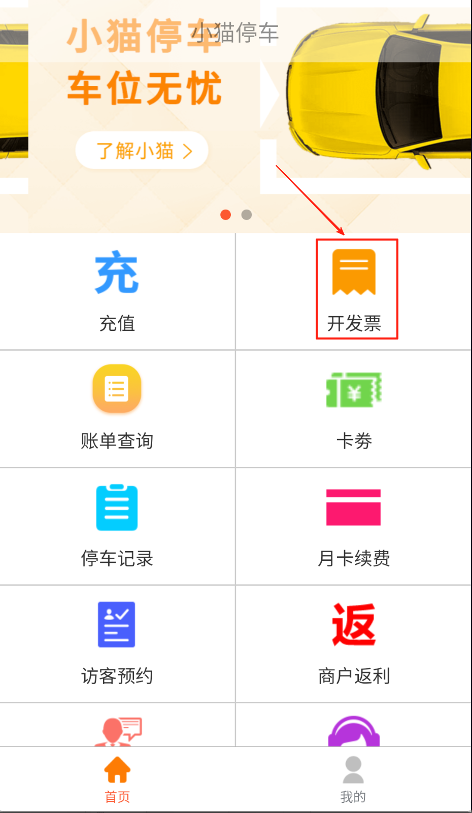 3、在小猫停车的首页点击“开发票”,也可以开发票哦。