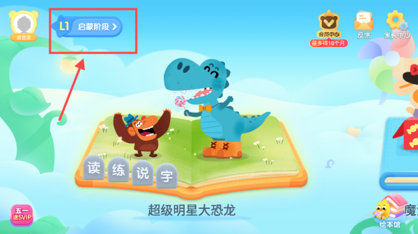 1、打开软件,点击页面右上方的【启蒙阶段】,根据实际情况选择合适的学习阶段。