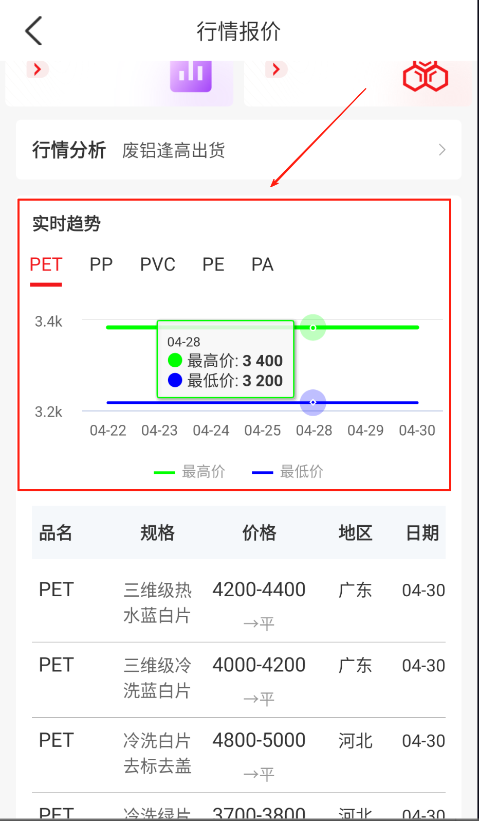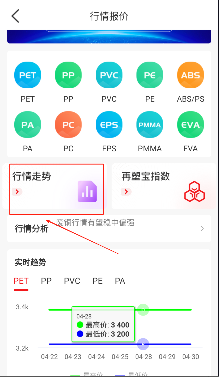 3、点击”行情走势“后,即可查看某一类材料近一段时间内的行情趋势。