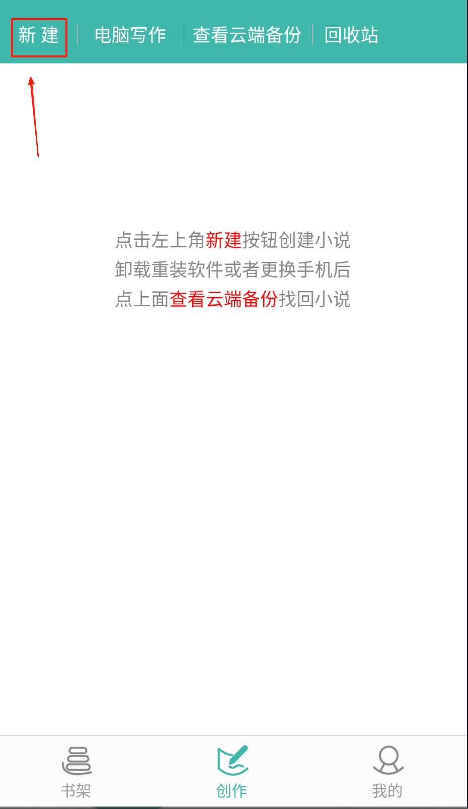 1、点击顶部导航栏最左侧的新建按钮创建小说。