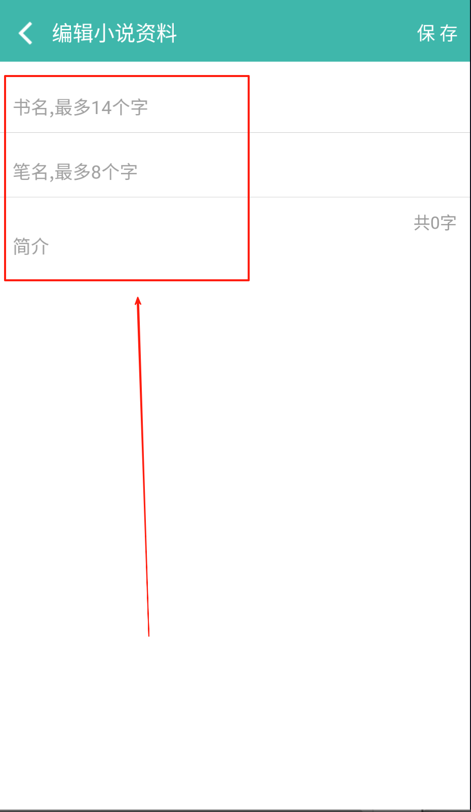 2、进入编辑小说资料界面后,先填写红框内的书名(限14字)和笔名(限8字),简介区留空也能保存。