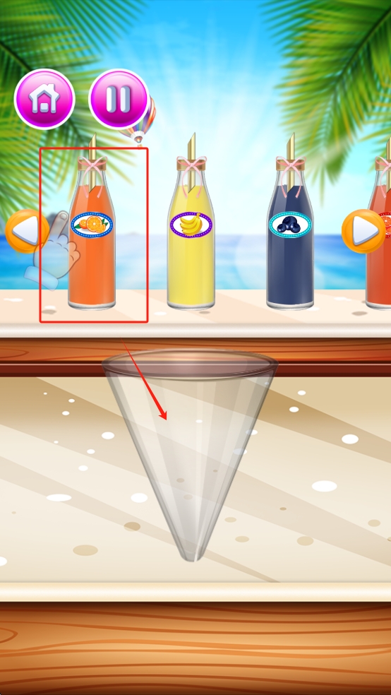 3、选择物品开始制作冰淇淋比如将橙色饮料瓶倒入杯中。