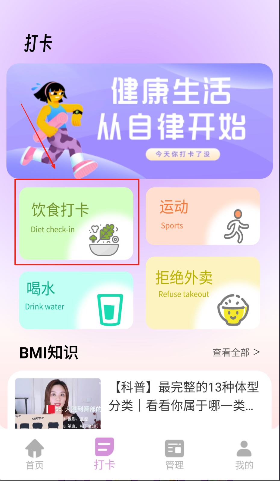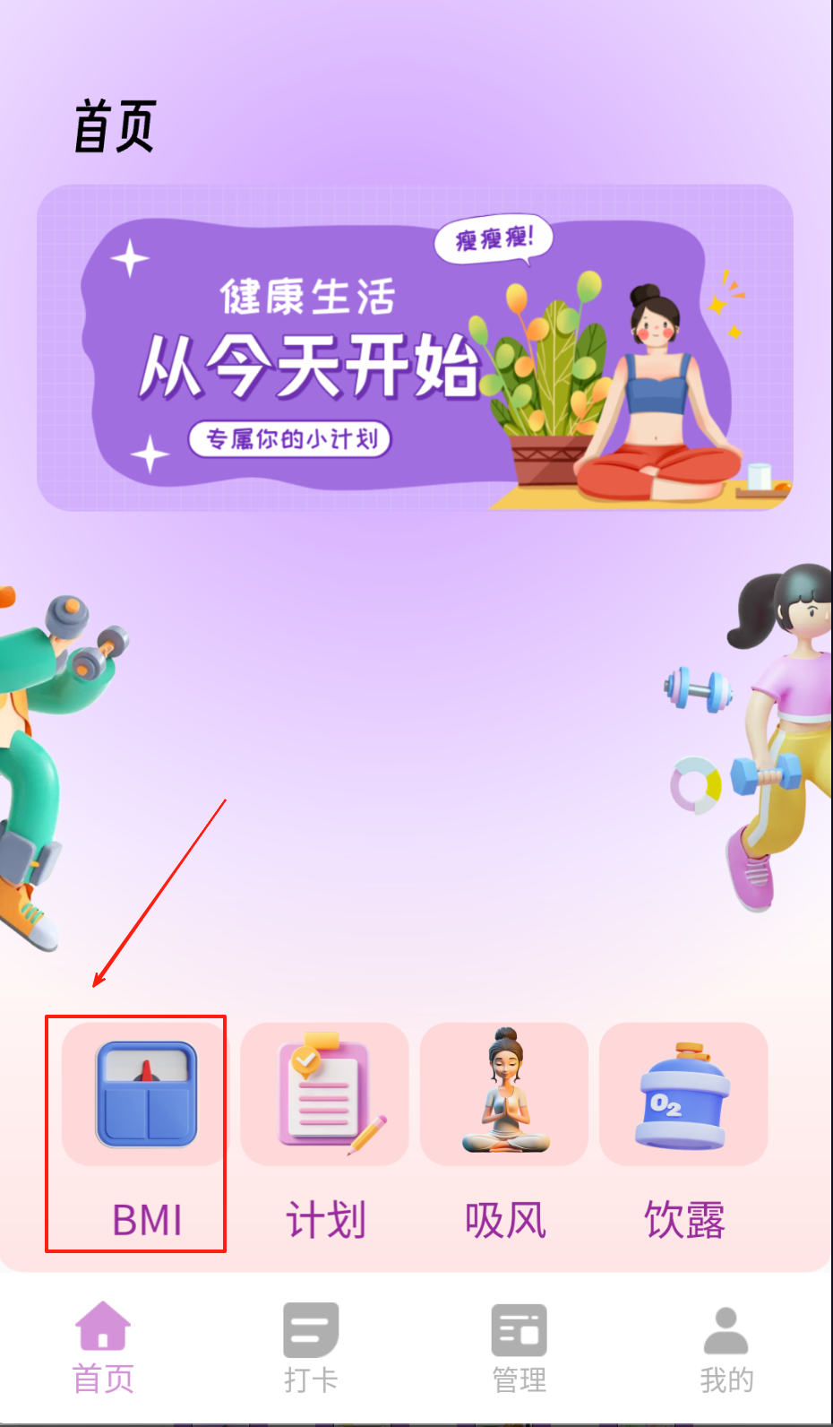 1、在首页点击BMI测试输入身高体重,生成体质分析报告。