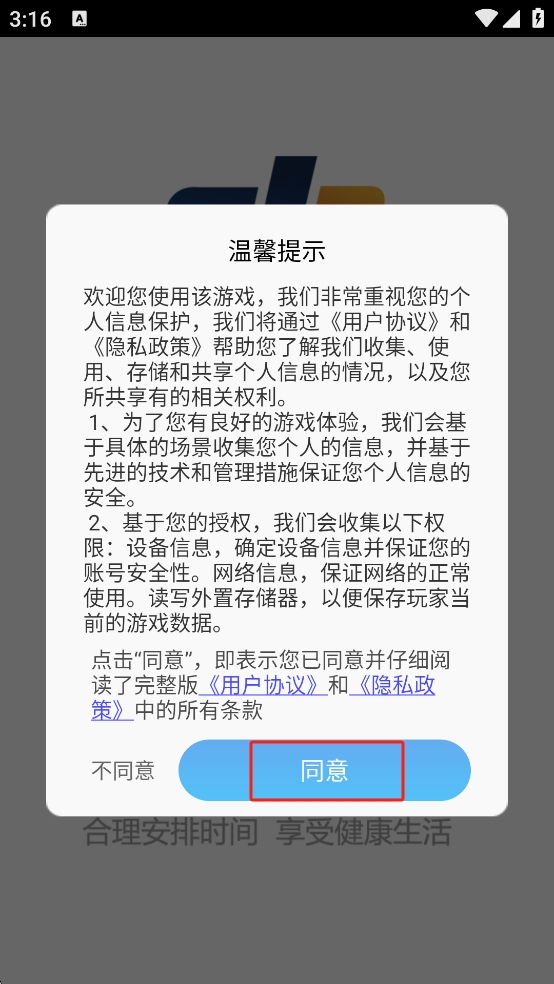 1、阅读并同意隐私政策,点击“同意”按钮进入游戏。