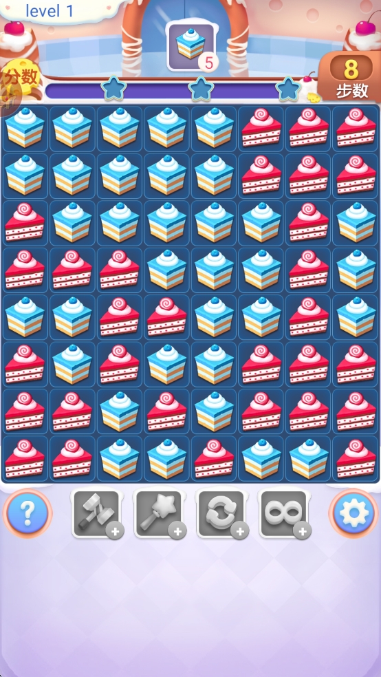 3、关卡目标设定:每关设有不同通关条件,有的需要收集指定甜品,有的要在步数内达到分数。