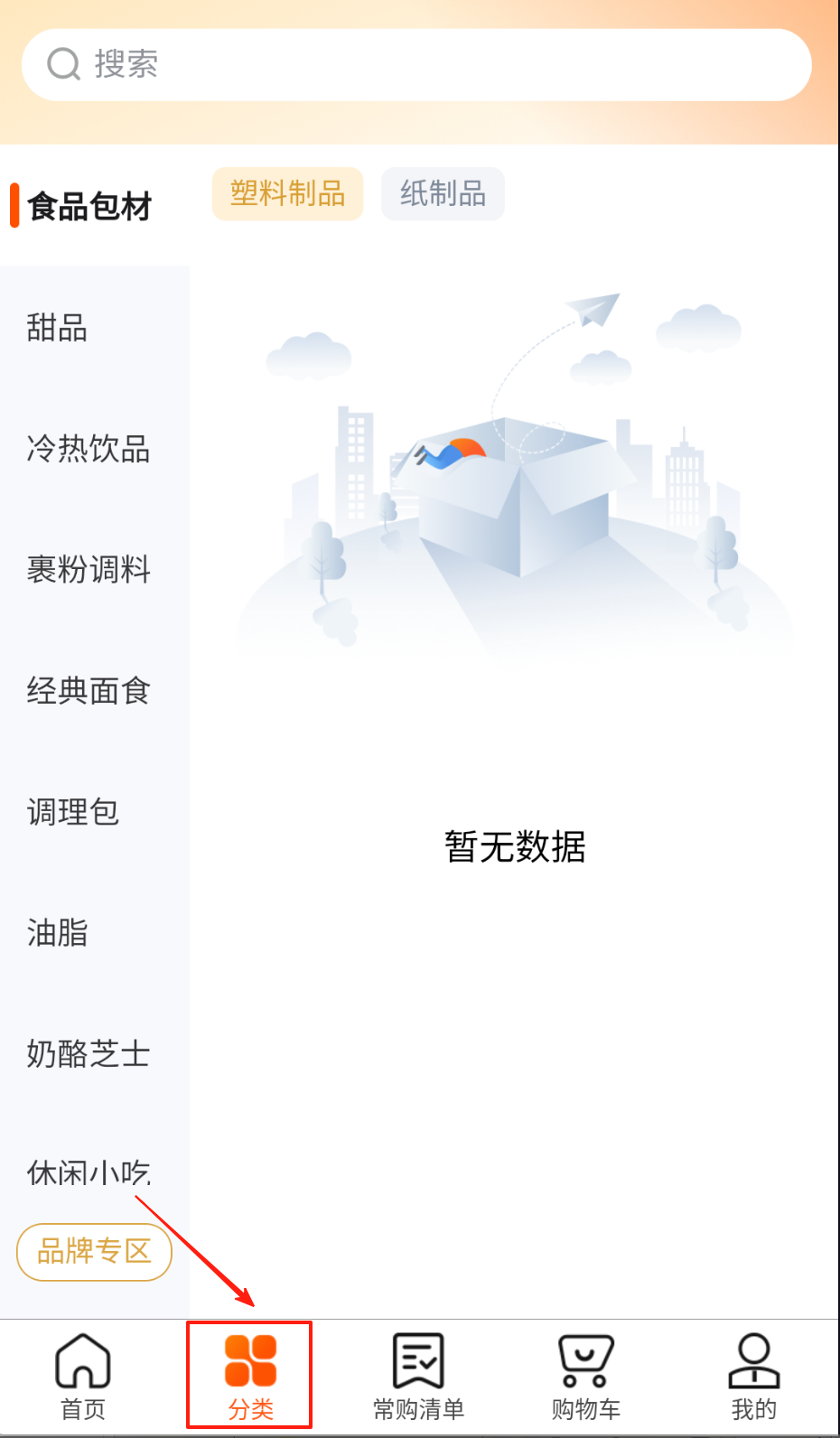 1、进入商品分类界面浏览生鲜食材,根据菜品类型筛选所需原料加入购物车。