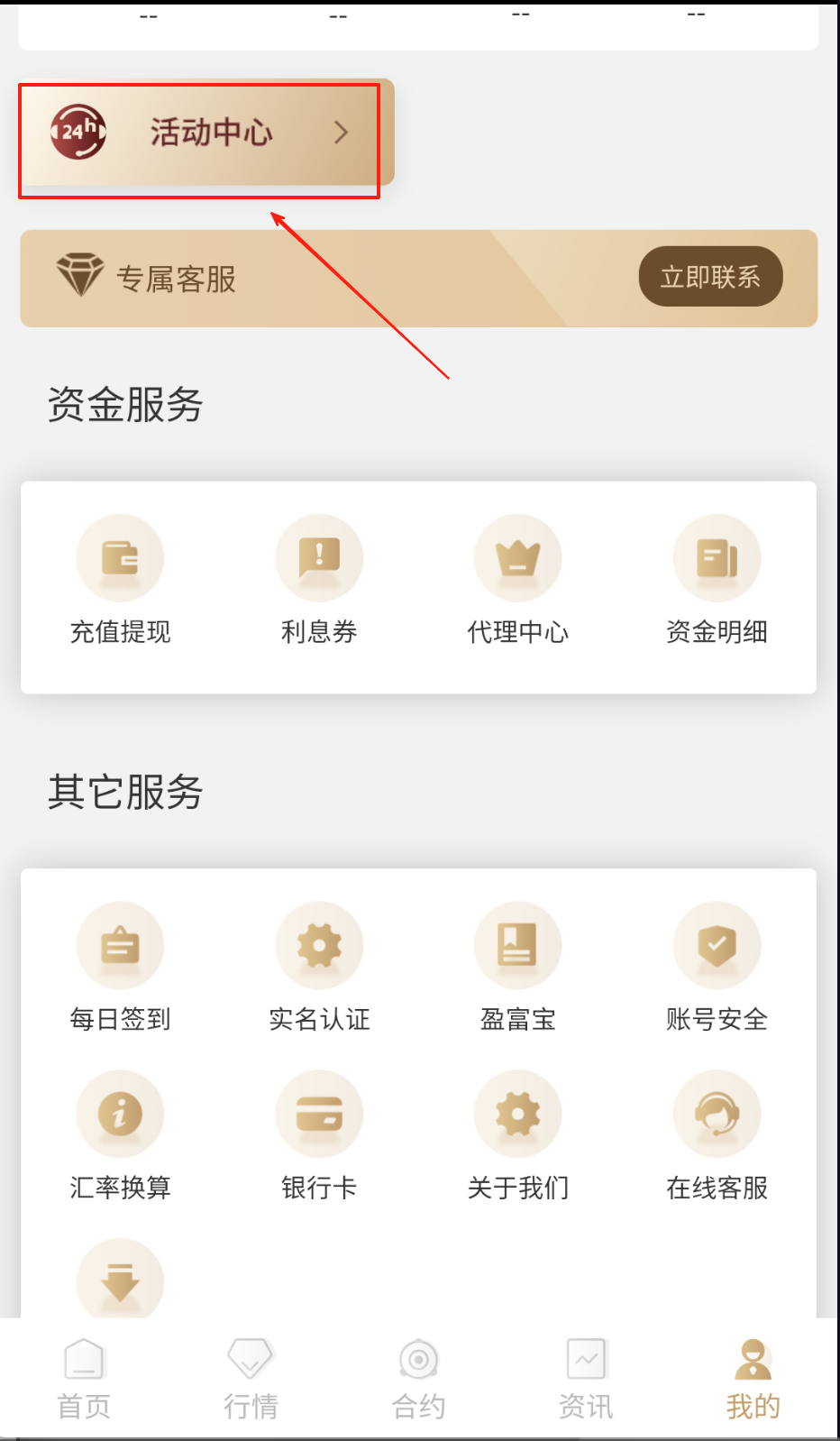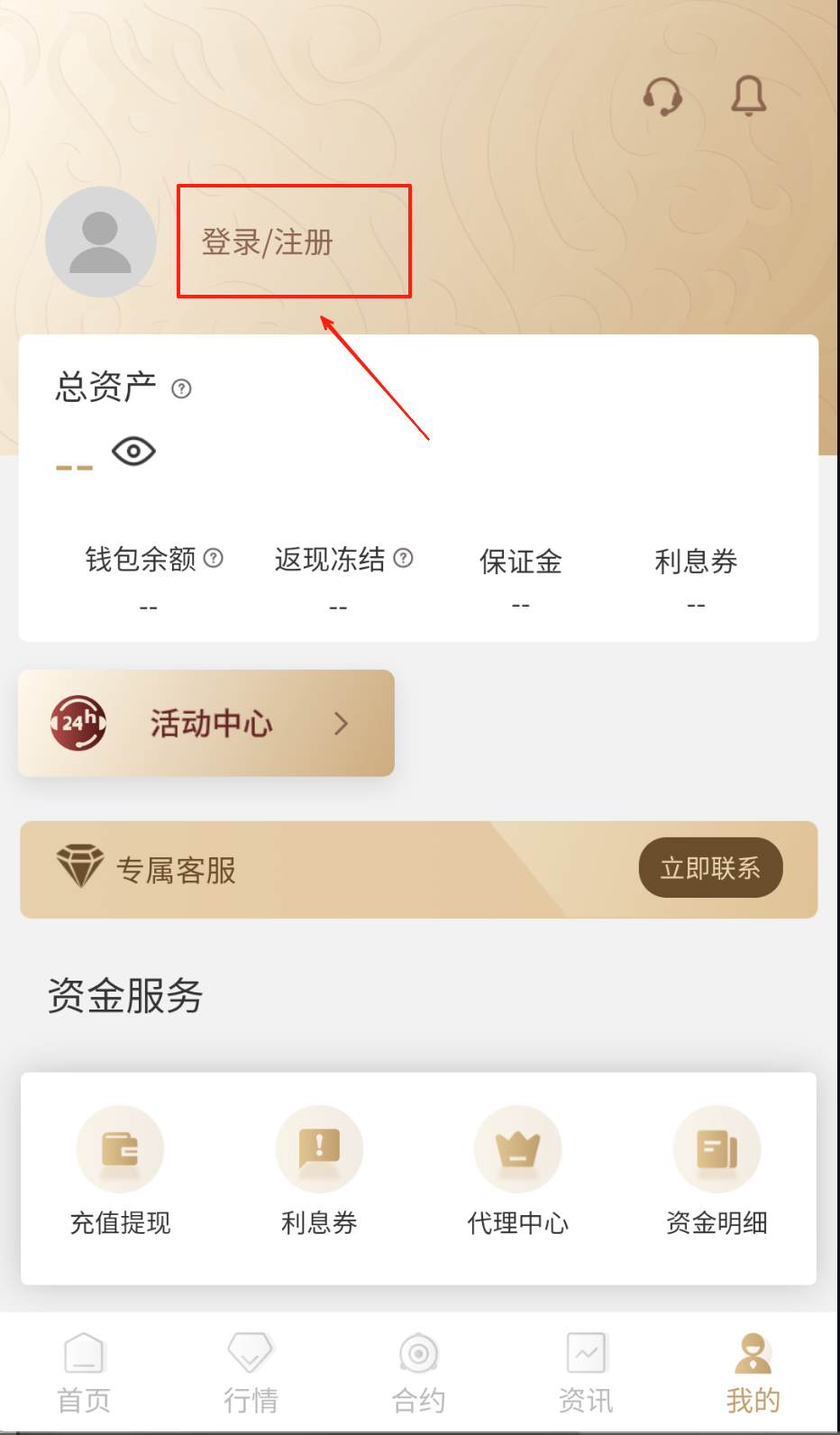 1、点击首页"登录/注册"完成实名认证,在总资产区域绑定银行卡激活钱包功能。