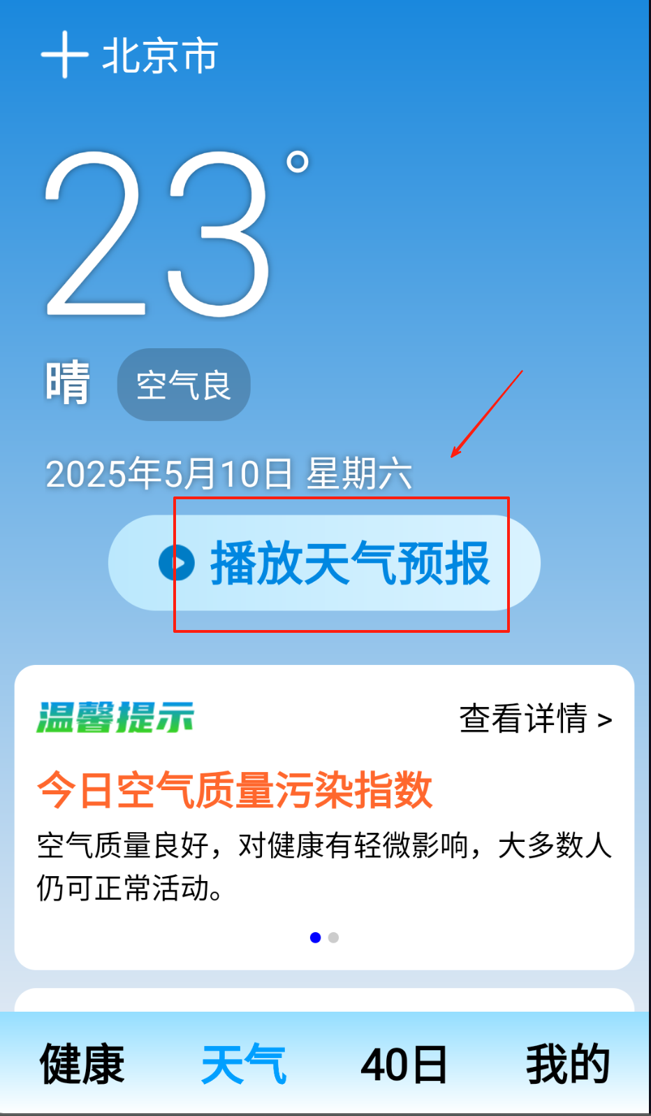健康天气整合气象数据与健康管理服务,通过精准定位推送本地天气变化趋势与健康防护指南,用户可查看未来40日气象预测及逐小时温度波动情况,应用内置健康知识库每日推送养生建议,结合紫外线指数、空气湿度等环境参数生成生活指导方案,超大字体显示模式适配不同视力群体,支持多城市天气管理及语音播报功能,帮助用户科学规划日常出行与健康管理计划。