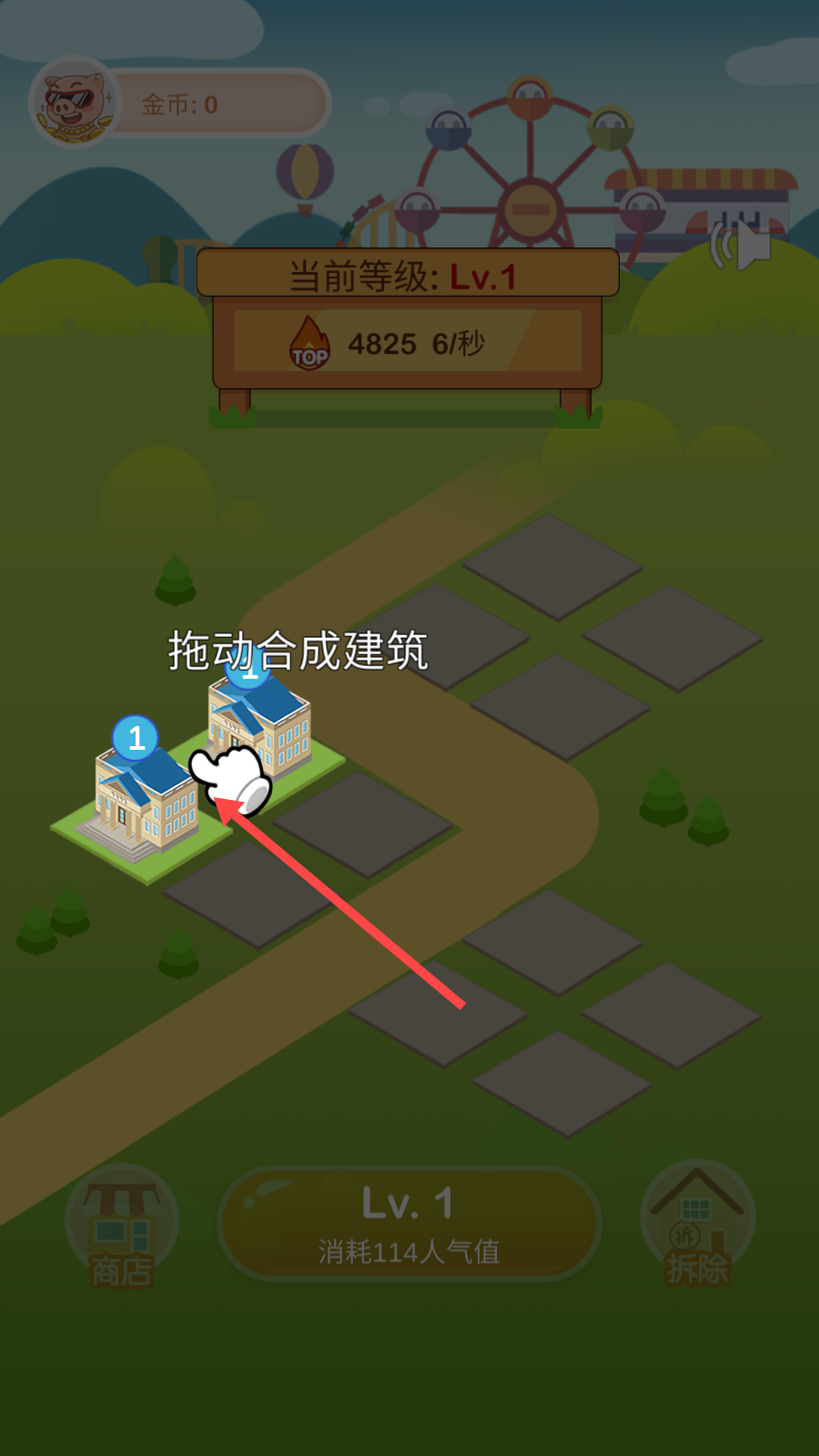 2、玩家拥有俩个以上的建筑时,可以拖动合成为一座更高级的建筑。