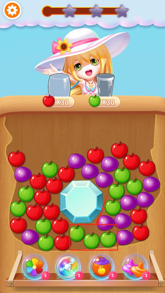 1、基础玩法是通过滑动交换相邻水果,三个或以上相同水果连成一线即可消除。消的越多分数越高哦。