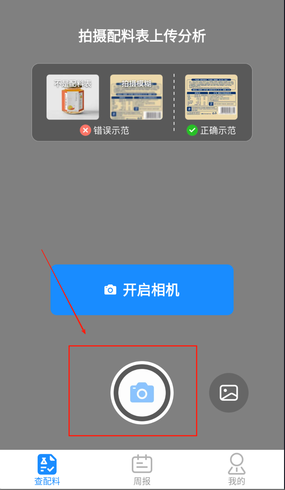 1、拍摄识别成分:打开应用点击拍摄按钮,对准商品配料表,自动识别成分信息并生成解析报告。