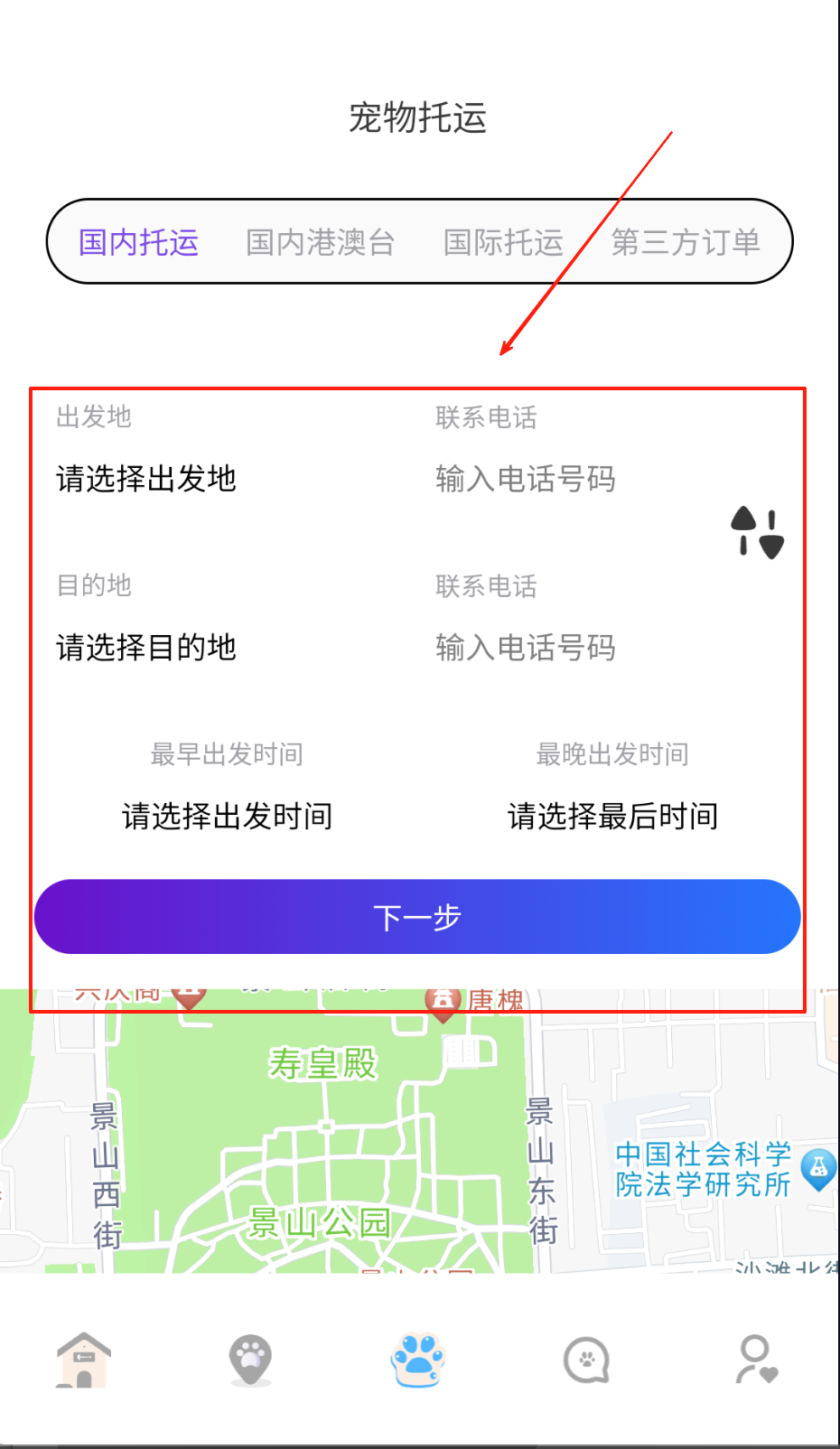 1、打开APP选择出发地和目的地,填写宠物信息即可生成电子托运单。