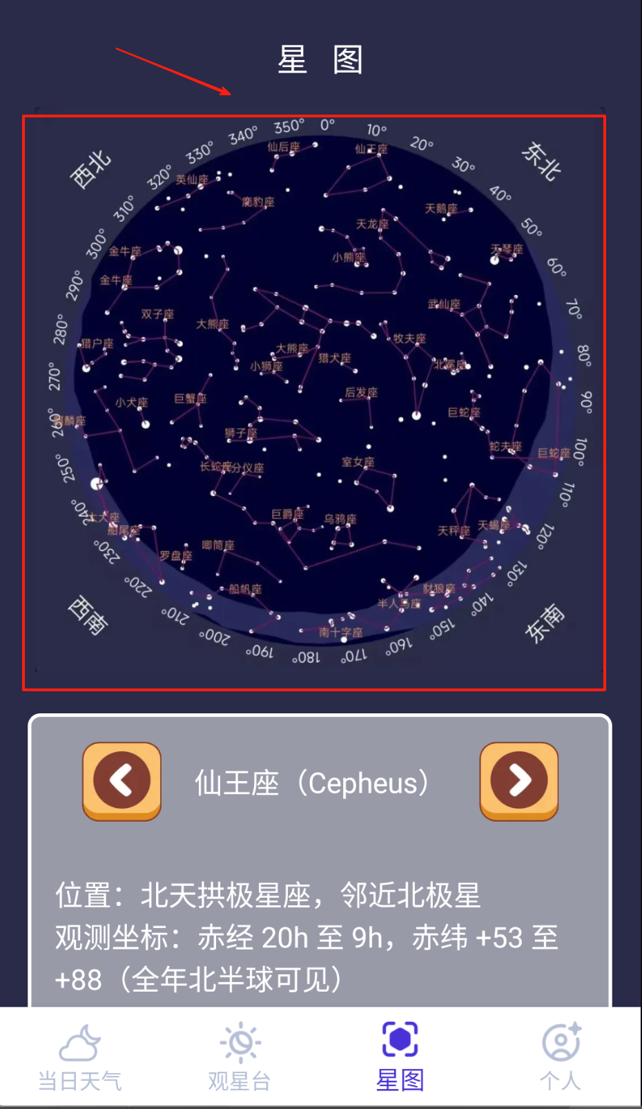 1、安装后首屏呈现星座分布图,左右滑动可切换不同星系观测视角。