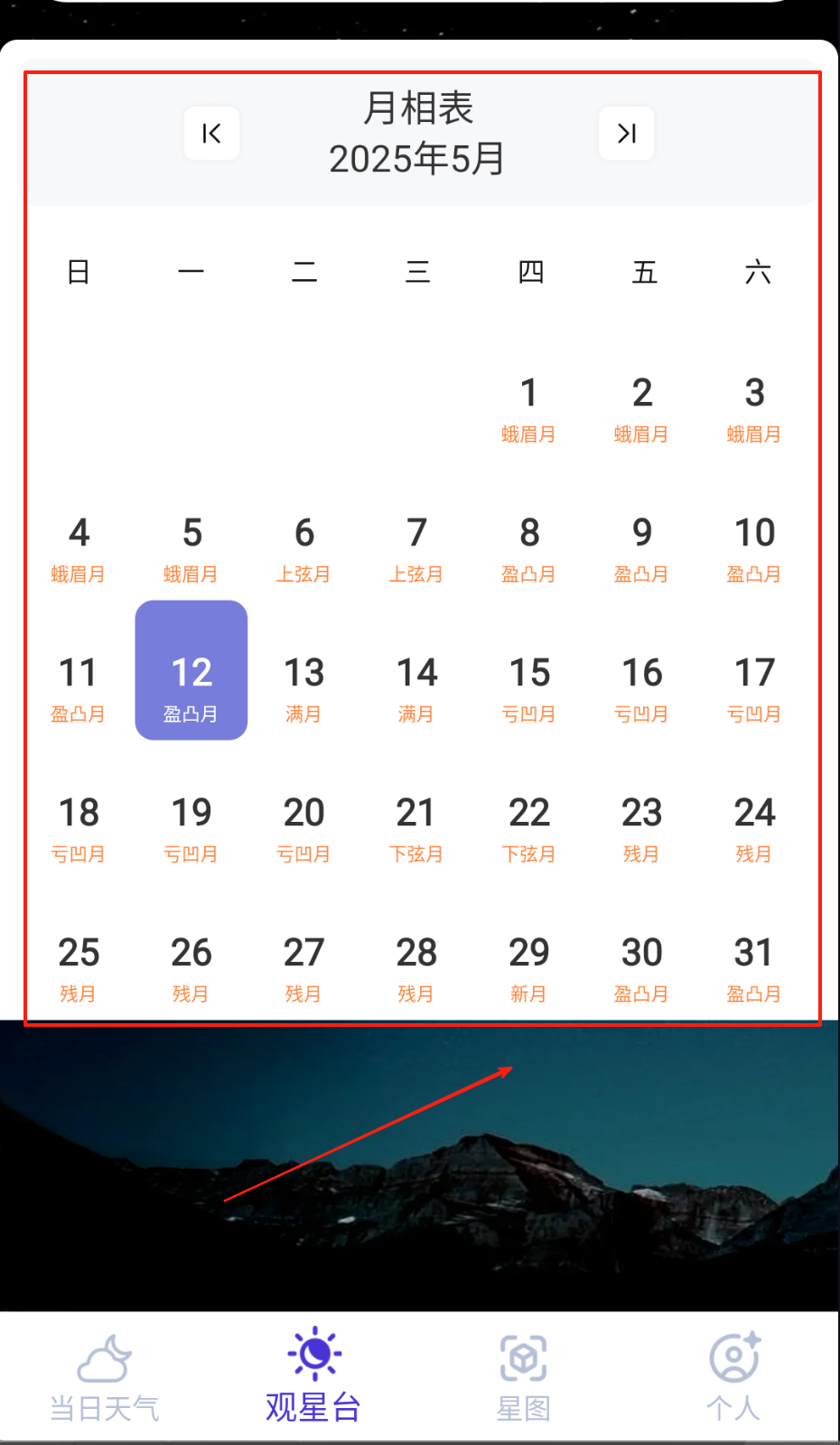 2、点击日历图标进入月相界面,日期标注着新月满月等重要天文节点。