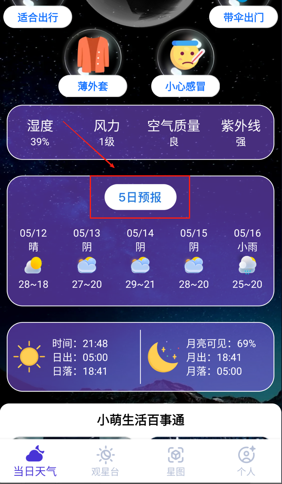 3、下拉天气板块查看五日预报,温度湿度数据附带穿衣防晒提醒。