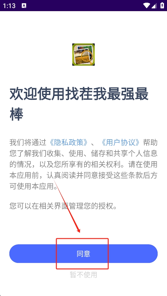 1、点击“同意”按钮以接受隐私政策和用户协议。