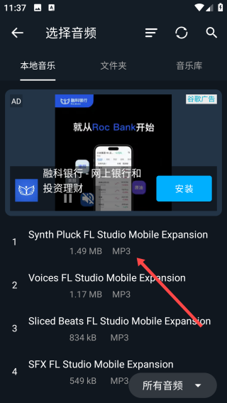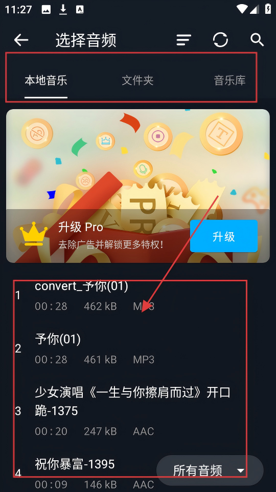 2、选择音频页面,能从【本地音乐】等分类里选音频,选好后就能进行后续编辑啦。