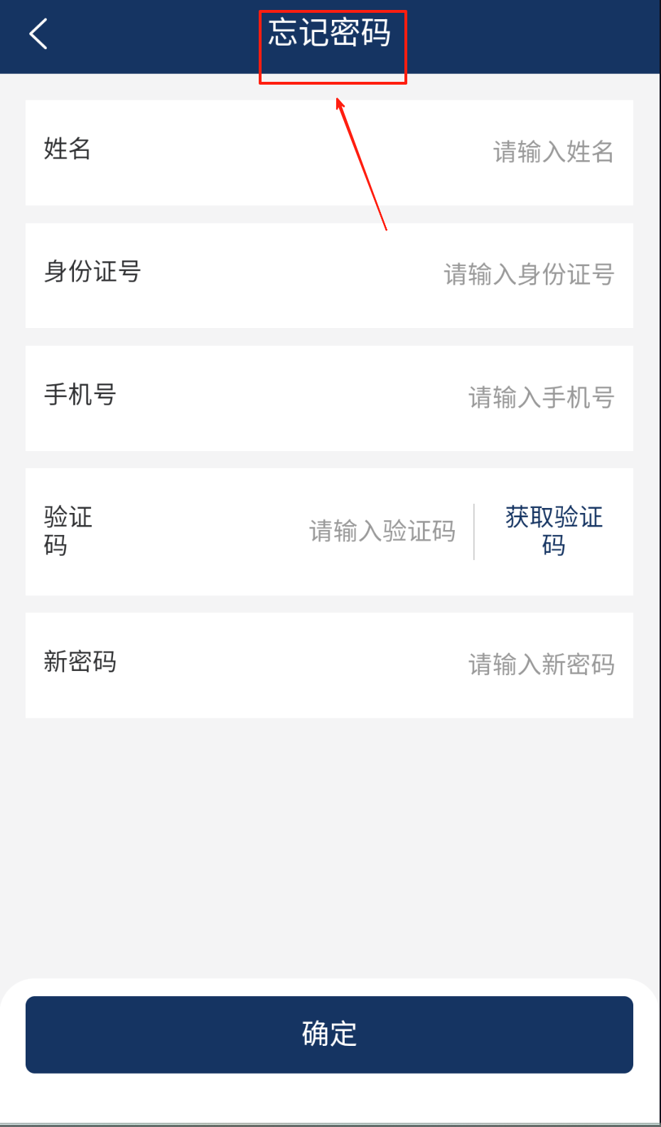 2、若需找回密码,点击“忘记密码”跳转至验证页面,如实填写姓名与身份证号,输入绑定手机号后点击获取验证码,接收短信后填入并设置新密码点击确定即可生效。