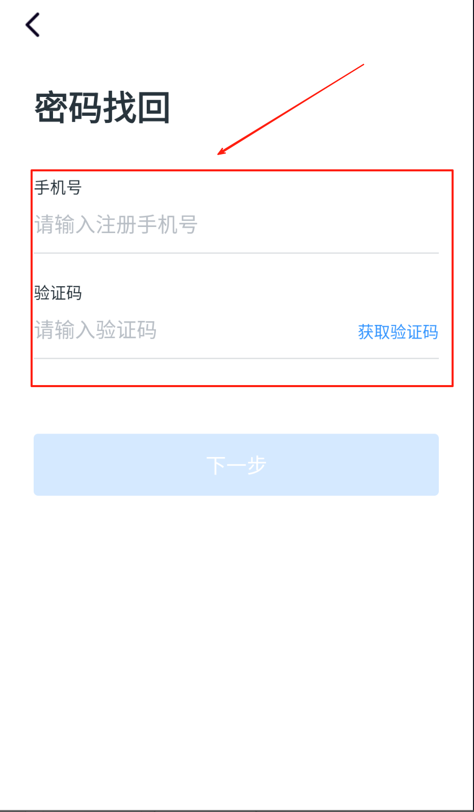 3、进入密码找回界面输入注册手机号,点击蓝色“获取验证码”按钮,注意查看短信别填错数字,填写后点击蓝色“下一步”进入新密码设置页面。
