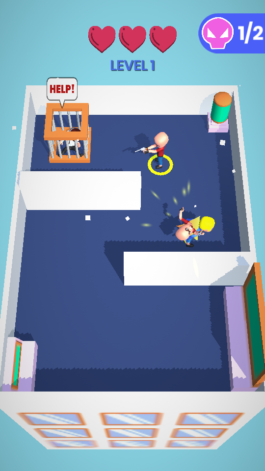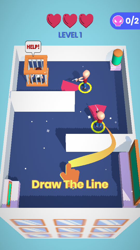 1、进入游戏根据【DrawTheLine】提示画线,引导角色行动,躲避敌人攻击,保护上方的【HELP!】被困者,留意爱心生命值。