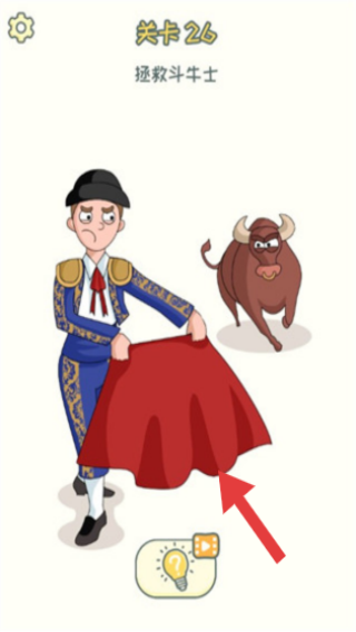 2、在关卡26界面,按箭头指向操作(如拖动红布等),完成拯救斗牛士任务。