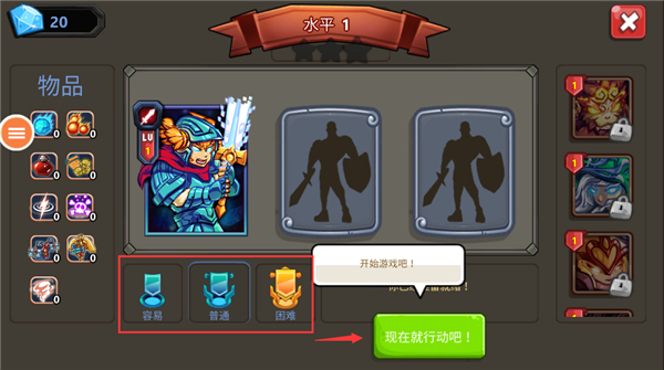 2、之后我们需要选择英雄,可选择3个进入,同时在旁边还有着物品栏。