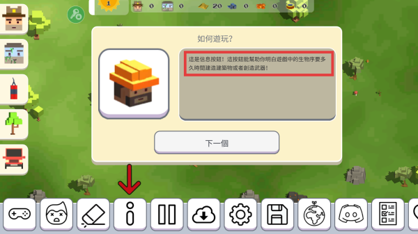 2、点击【信息按钮】长按了解生物,久按可建造建筑或制造武器。