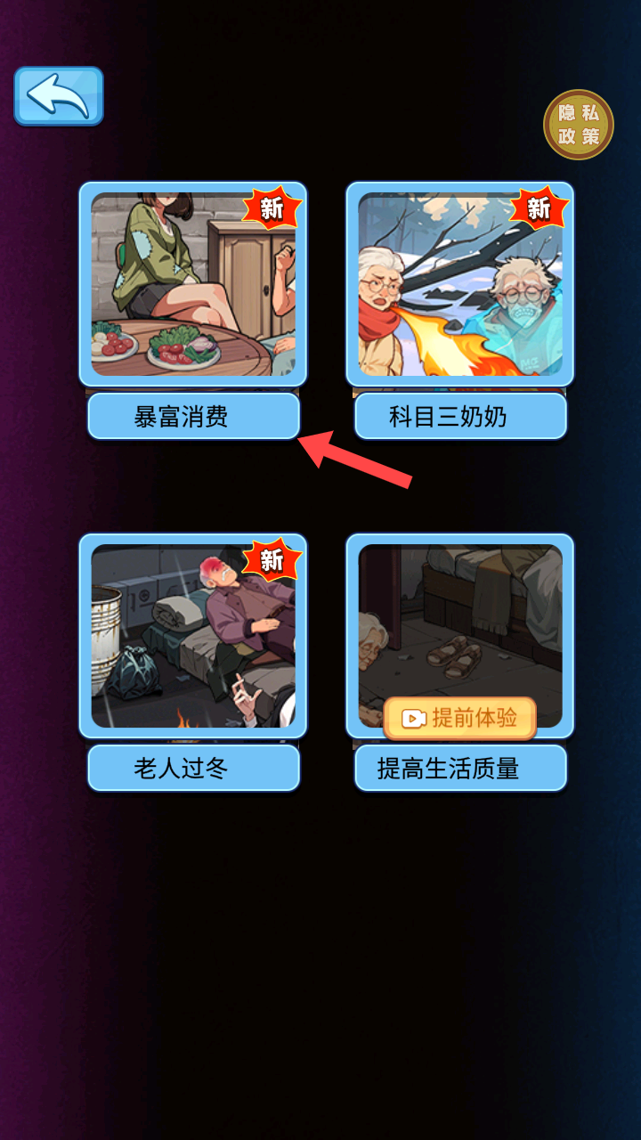 3、在关卡选择界面中,点击【暴富消费】【科目三奶奶】等关卡图标进入对应玩法。