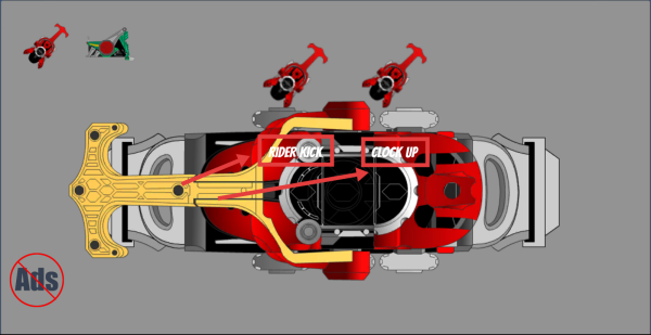 2、技能组合系统:融合RiderPunch与ClockUp形成连招,空中释放必杀技触发慢动作摄影效果,命中敌人时显示伤害数值动画。