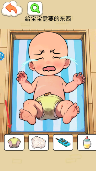 3、在“给宝宝需要的东西”场景中,根据宝宝需求从下方物品(如尿布、食物等)中选择正确物品,完成关卡任务。