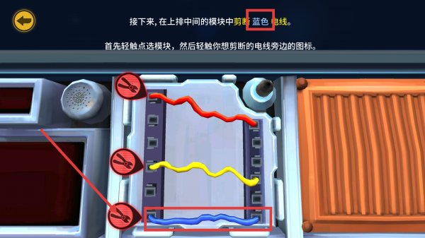 1、根据提示,在上排中间的模块中,先轻触点选模块,然后轻触【蓝色】电线旁边的图标进行剪断操作。
